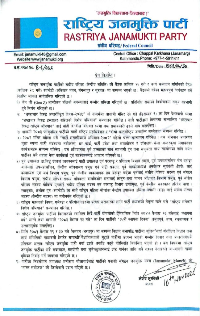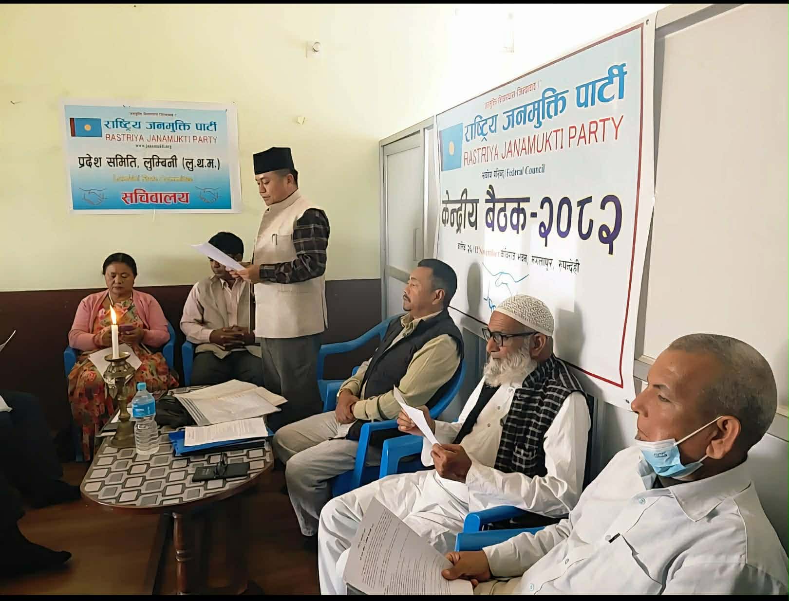 संघीय परिषदकाे बैठक सम्पन्न। – प्रतिनिधि सभाको निर्वाचनमा सहभागी हुने -भ्रष्टाचार विरुद्ध राष्ट्रिय अभियान संचालन गरिने – अन्तरराष्ट्रिय जनमुक्ति सम्मेलन आयोजना गरिने। राष्ट्रिय जनमुक्ति पार्टीको विधानकाे आधिकारिकताकाे विषयमा १५ महिना सम्म चलेको अन्तरसंघर्षकाे पछि २०८२ कार्तिक २६ गते संघीय परिषद(केन्द्रीय समिति) काे बैठक बसि बिभिन्न निर्णयहरु गरिएको छ। पार्टीकाे लुम्बिनी प्रदेश एवं रुपन्देही जिल्लाकाे कार्यालय भवन(कविराज भवन, मंगलापुर) मा पार्टी अध्यक्ष केशव सूर्यवंशीको अध्यक्षतामा वसेको वैठकले बिभिन्न महत्त्वपुर्ण निर्णयहरु गरेको छ। बैठकले पार्टीकाे घोषणा वर्ष २०४७ वैशाख २३ लाई आफ्नो स्थापना वर्ष मान्ने, आगामी ०८३ वैशाख २३ गते ३६औं स्थापना दिवस भव्य रूपमा मनाउने, बर्ष ०८३ भित्र अन्तरराष्ट्रिय जनमुक्ति सम्मेलन र पार्टीकाे सातौं राष्ट्रिय महाधिवेशन आयोजना गर्ने निर्णय गरेको छ। यसै गरि, भ्रष्टाचार विरुद्ध अन्तरराष्ट्रिय दिवस-२०२५(डिसेम्बर ९/मंसीर २३ देखि भ्रष्टाचार विरुद्ध हस्ताक्षर सहितको अभियान अघि बढाउने, राष्ट्रिय सरोकारका विषयलाई निगरानी गर्ने गरि विशेष अभियान सञ्चालन गर्ने, फागुन२१ काे लागि घोषणा गरिएको प्रतिनिधि सभाको निर्वाचनमा भाग लिने निर्णय पनि गरेको छ। बैठकले संघीय परिषदकाे उपाध्यक्षमा डा. विधु प्रकाश कायस्थ(काठमाण्डौ), उपमहासचिवमा चेत बहादुर आले(मोरङ), कोषाध्यक्षमा धनकेशर सूर्यवंशी(पाल्पा/ललितपुर), संघीय परिषदमा डब बहादुर गर्वुजा पुन(नवलपरासी/काठमाडौं?, अशोक पुन(रूपन्देही), हरिदेव थापा(स्याङ्जा), गोविन्द पुन (प.रुकुम)र उर्मिला नेपाली(दाङ) लाई मनोनित गरेको छ। यसै गरी कार्तिक २८गते रूपन्देही मै वसेको पदाधिकारी(कार्य संपादन) को बैठक ले नेताहरुको विभागीय जिम्मेवारी समेत तोकेको छ। बैठकको निर्णय बारे कार्तिक ३० गते अध्यक्ष केशव सूर्यवंशी द्वारा प्रेस विज्ञप्ति मार्फत सार्वजनिक गरिएको छ।